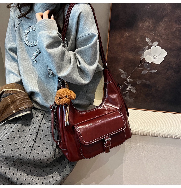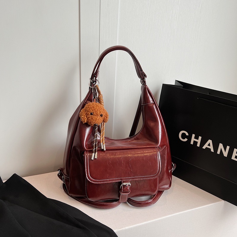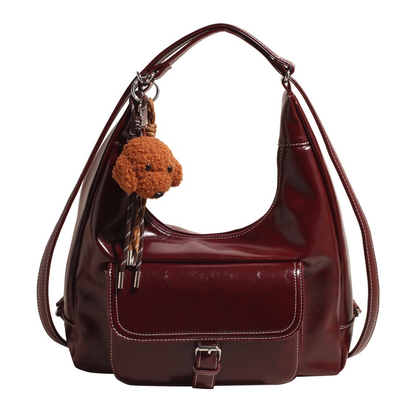 Elevate your everyday style with the Bordeaux Luxe Hobo, a sophisticated and spacious handbag designed for modern elegance. Crafted from high-gloss faux leather in a rich wine-red hue, this bag exudes luxury while maintaining practicality. Featuring a unique crescent silhouette, contrast stitching, and a secure front pocket with a chic buckle detail, it’s perfect for both casual and formal occasions. The adorable plush puppy keychain adds a playful charm, making it a standout piece. Carry it as a shoulder bag or use the adjustable strap for crossbody convenience.