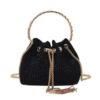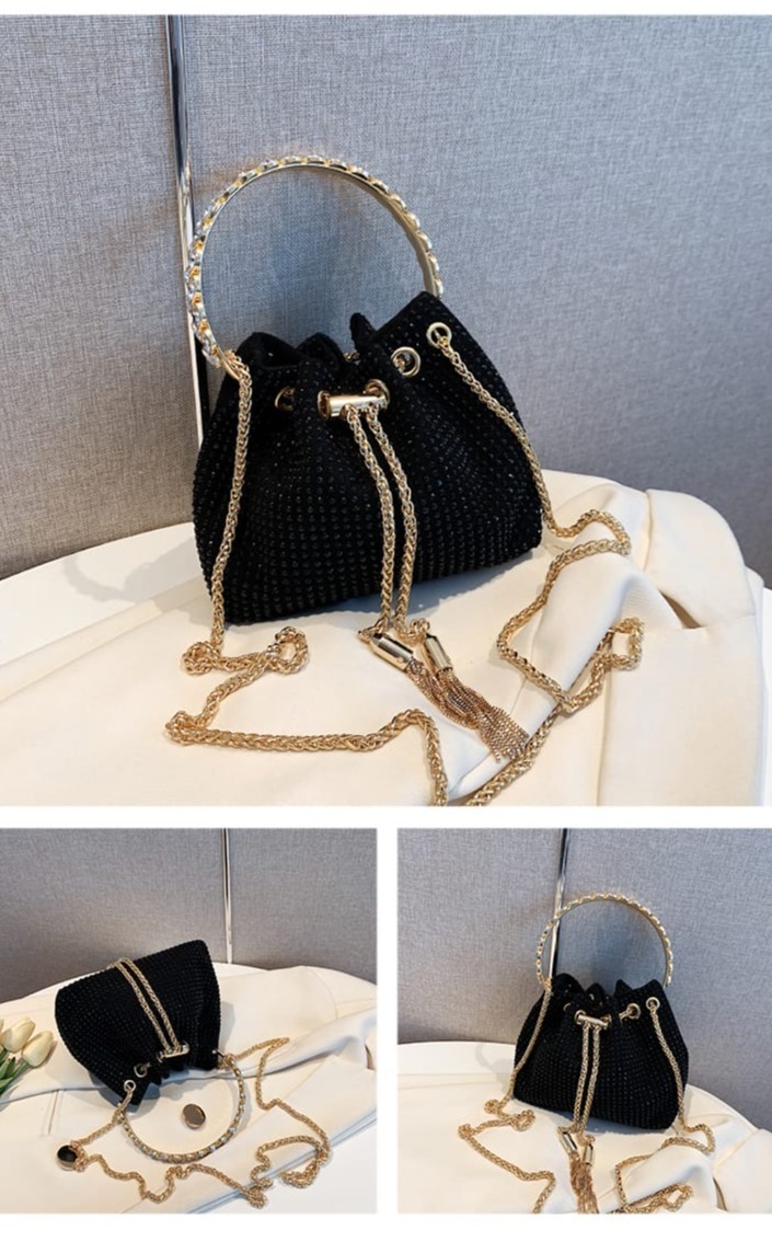 Optional cross-body strap chain strap Bucket Bag Magnetic Closure and open top Top handle Diamonds décor handle Crystal Rhinestone designer party bags evening party bag. Small bag fashionable bag Please note that the colour might very a little because of different lights in which the product has been shot.