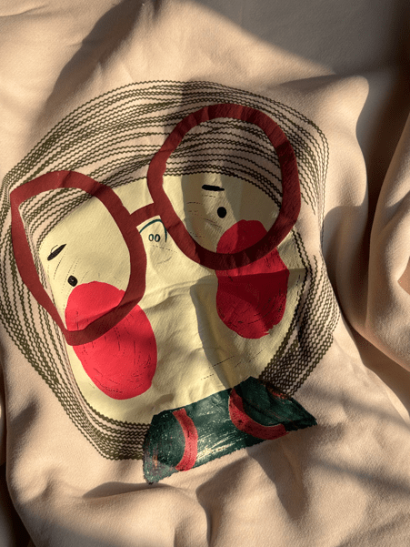 Design: Abstract twin faces with red glasses and headwear, joined by a green-red bow motif