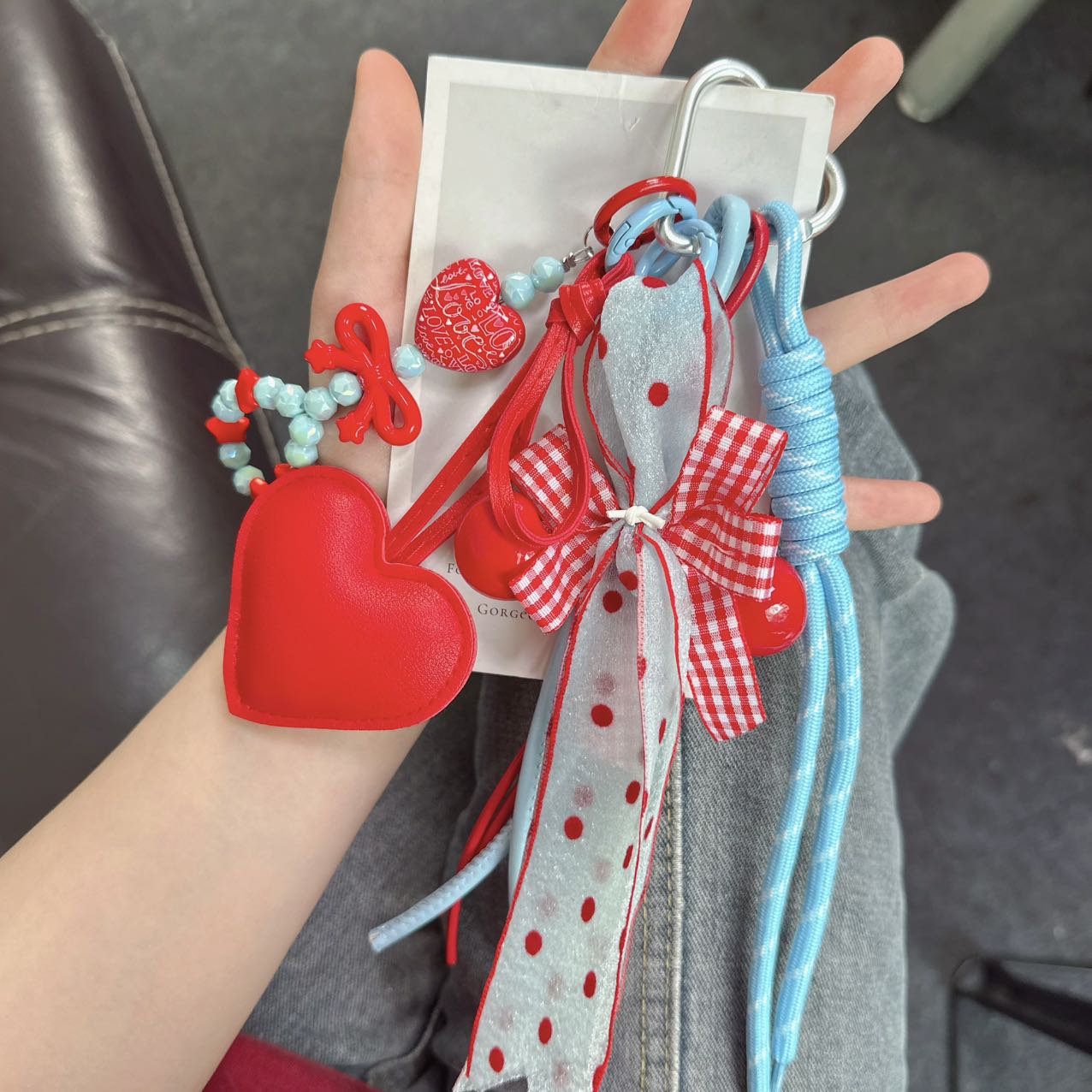 Make a statement with the Heart & Bow Charm Set, a collection of elegant, handcrafted keychains designed for those who love bold red accents and textured details. Featuring a large red heart, a fabric bow, a braided blue cord, and a checkered ribbon charm, this set blends classic romance with a modern touch. Whether added to a handbag, backpack, or keys, these eye-catching charms bring a fashionable pop of color to everyday accessories.