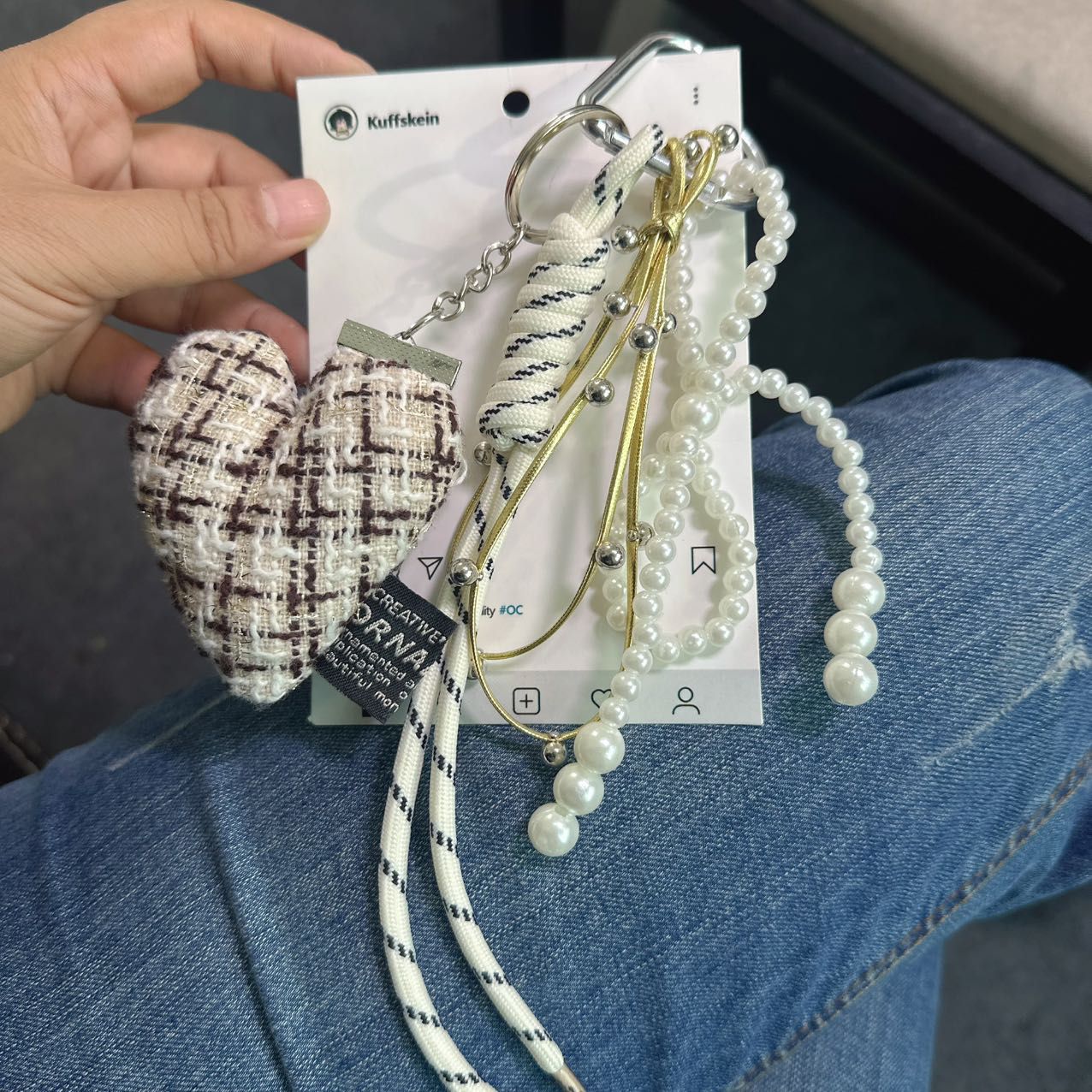 - Includes 4 charms: plaid heart, rope loop, pearl strand, gold chain