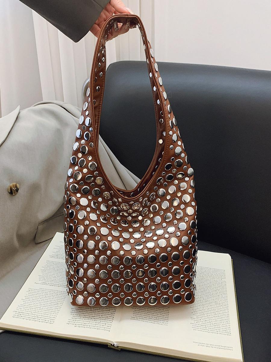 This sculptural hobo bag is a bold reinterpretation of the classic shoulder carry—featuring a constellation of metallic studs that shimmer like city lights. Designed for those who crave quiet drama, it’s a slouchy, spacious piece that blends artful texture with everyday ease.