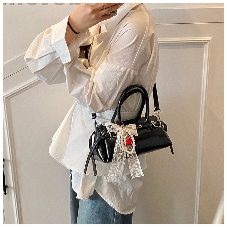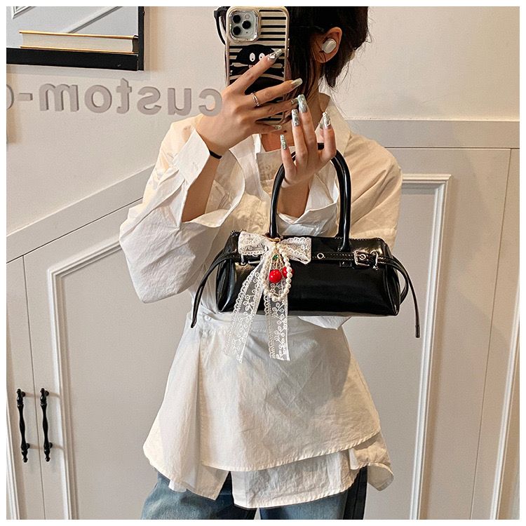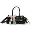 Sweet meets sleek with Charmink, the glossy black shoulder bag that balances edgy sophistication with delicate flair. With its gleaming faux leather, silver hardware, and a decorative charm featuring a lace bow, pearls, and a pop of red, it turns everyday outings into style statements.