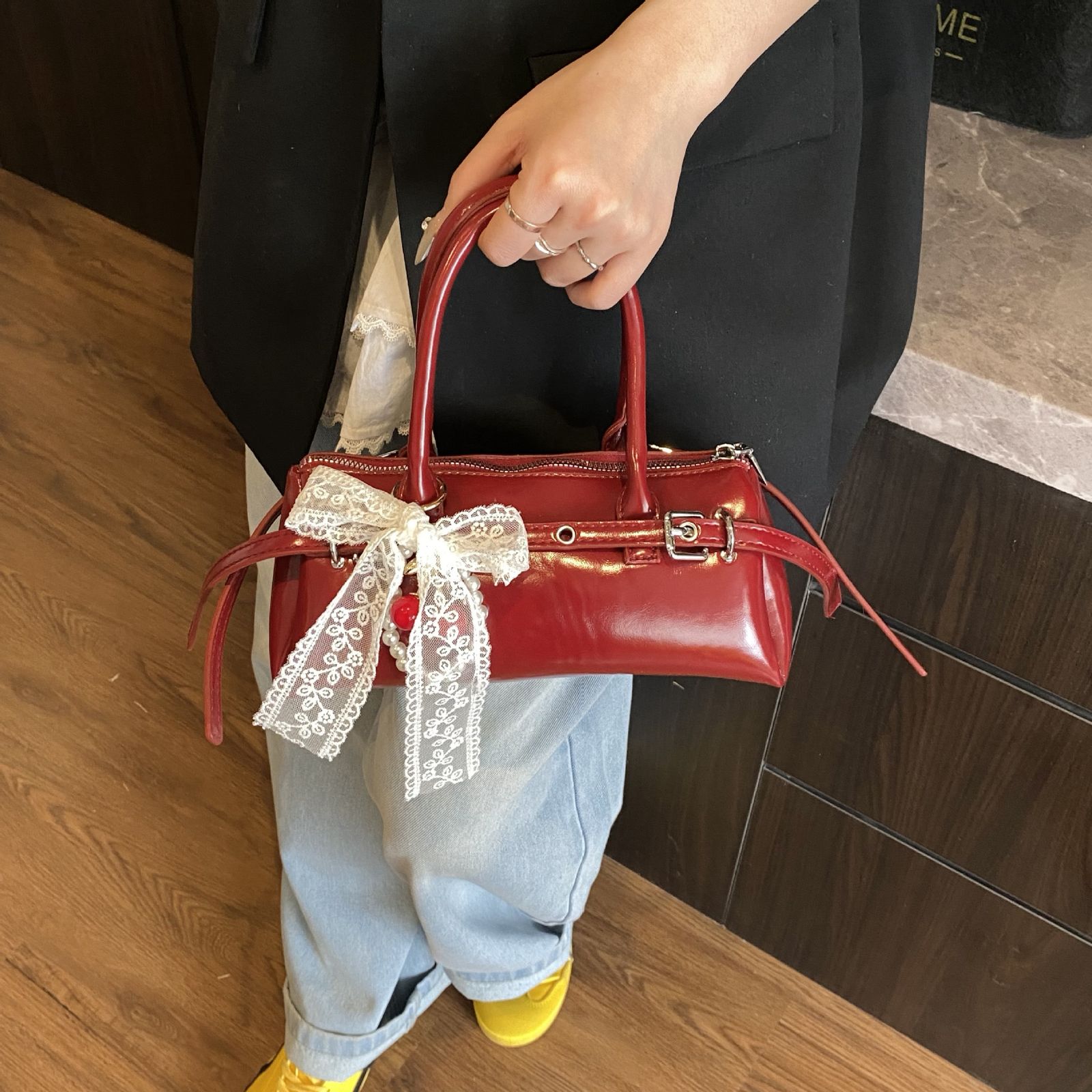 • High-gloss texture: Glossy red synthetic leather for luxe impact
