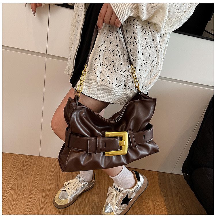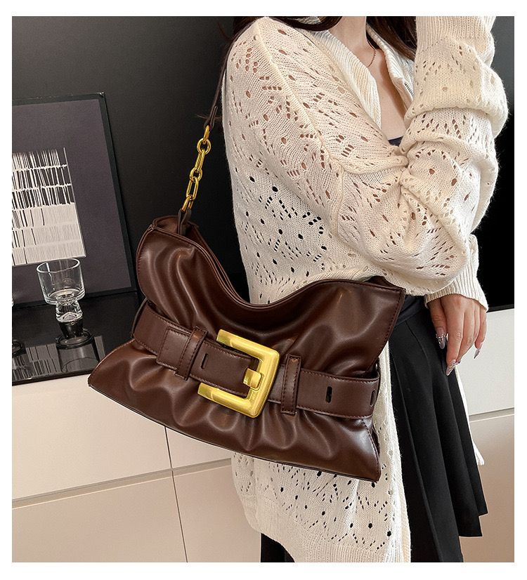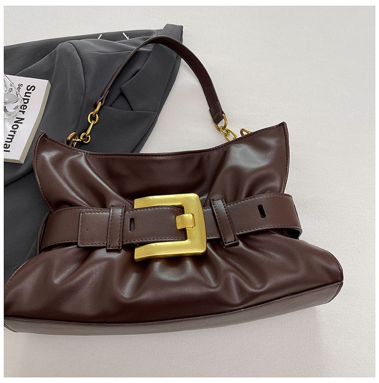 - Design: Soft gathered texture with gold buckle
