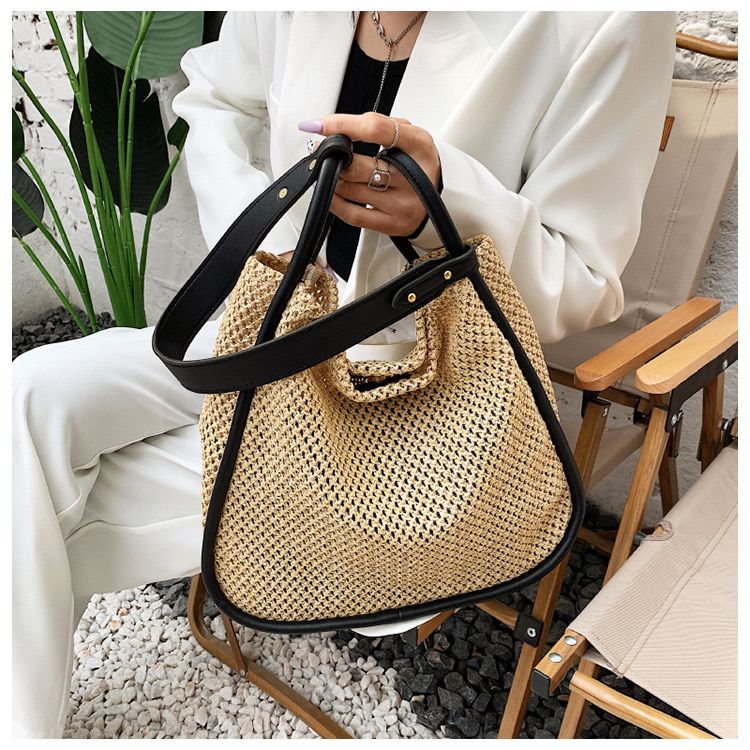 - Material: Straw weave body + glossy black faux leather trim