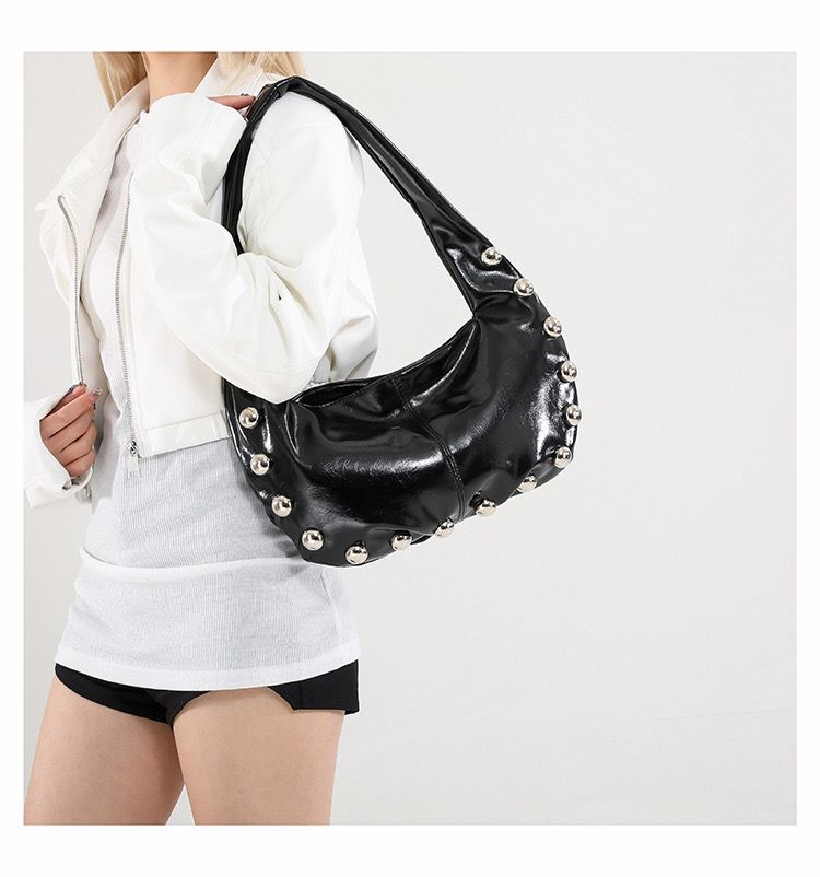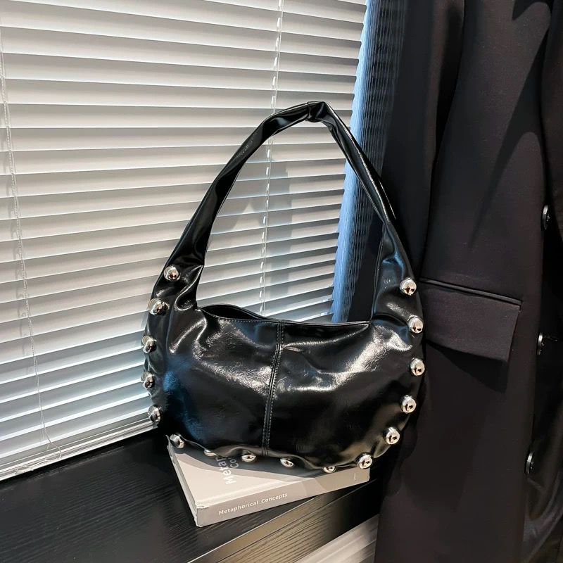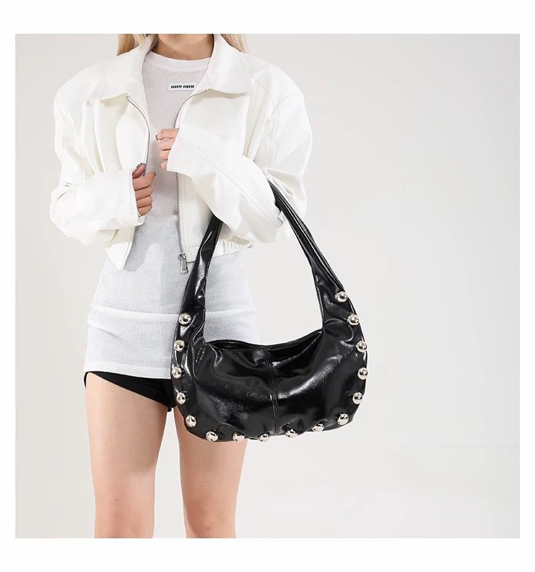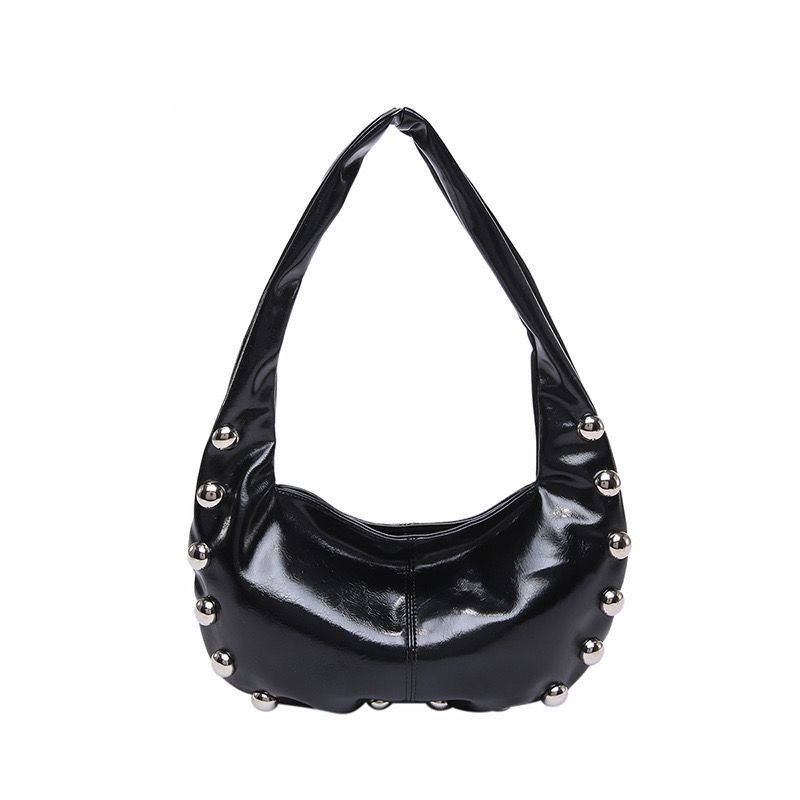 Refined rebellion meets luxe minimalism with Studveil, your go-to shoulder bag for curated looks that speak softly but carry major style. The unique looped strap design adds sculptural flair, while the silver spherical studs bring a flash of attitude to this glossy noir canvas. Built for outfits that say “I woke up iconic.”