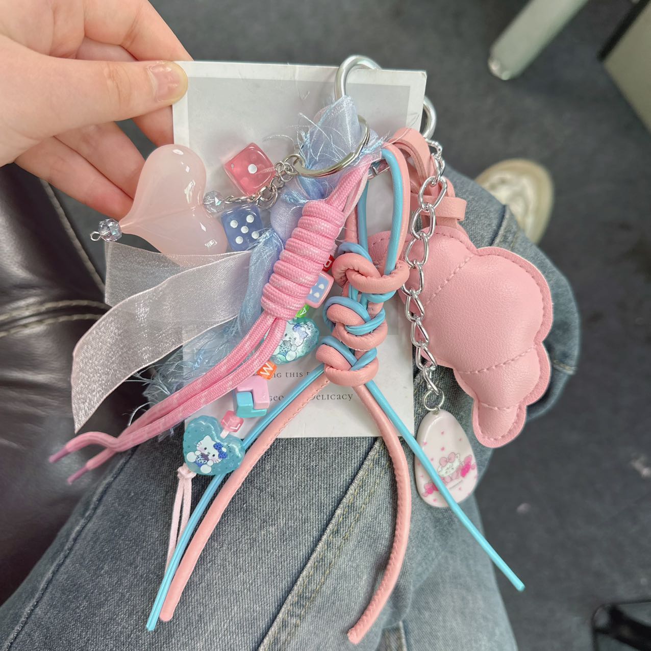 - A delicate pink heart-shaped charm with a glossy finish, paired with a pink dice bead for a playful touch.